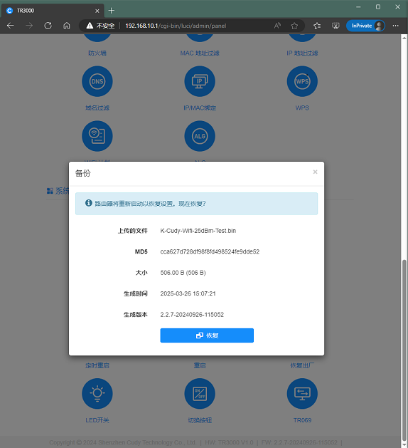 撸法跟以往同样的手法,直接 >>>高级设置>>>最下面“系统栏目”里>>>备份/恢复,上传 K-Cudy-Wifi-25dBm-Test.bin 文件后等待系统重启!