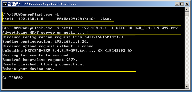 关机状态下利用 nmrpflash 工具刷入 netgear-bzv_3.4.9.9-099.trx 这个固件,把固件和 nmrpflash 放在同目录下输入命令,前提先装好 winpcap 后!
