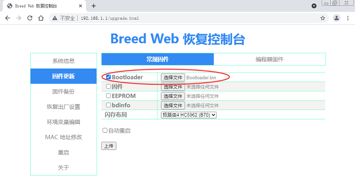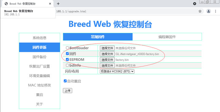 在breed 里选择 固件更新 先将之前备份factory.bin 的备份,在 EEPROM 选项加载 factory.bin 文件,然后再加载固件后一并更新!然后重启即可进系统了!