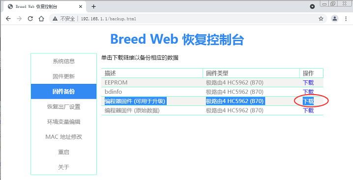 刷完原厂uboot 后就可以进行 编程器固件 备份了,如图中所示下载编程器固件保存,然后再把 breed-mt7621-hiwifi-hc5962.bin 从上面的步骤里刷回去!