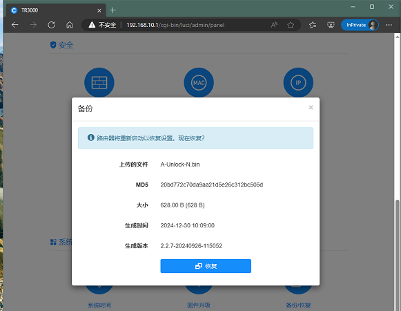 第一步,登录原厂管理页面后来到“备份/恢复”选项,选择 A-Unlock-N.bin 这个敲门砖文件,然后点恢复等自动重启!