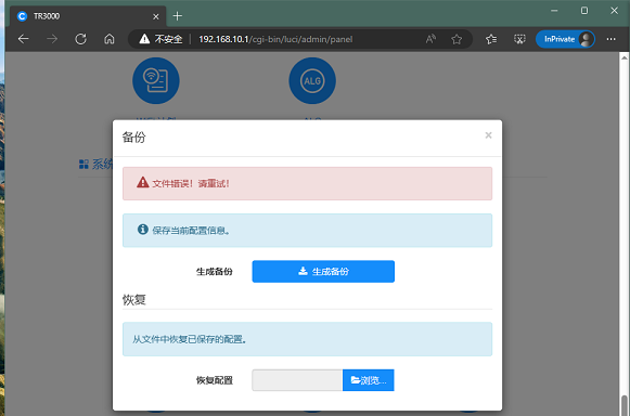 第二步,再次来到“备份/恢复”选项,由于刚才已经喂入了敲门砖,所以接着从这里上传喂入我们的 B-Luci-N.bin 或 C-Luci+Uboot-N.bin 脚本文件,然后点击恢后来到了关键环节,提示文件错误选择无视!脚本此刻其实已经展开活塞运动了 …..